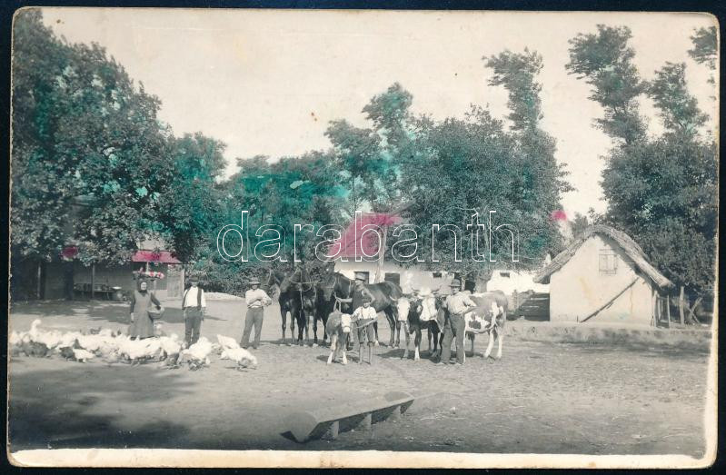 cca 1930 Falusi életkép, kézzel színezett fotó, 9×13 cm