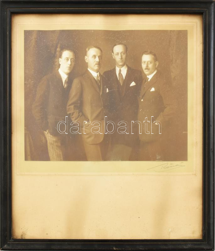 cca 1930 Férfiak csoportképe, kartonra kasírozott fotó, üvegezett keretben, Rónai Dénes műterméből, aláírt, 17×22 cm