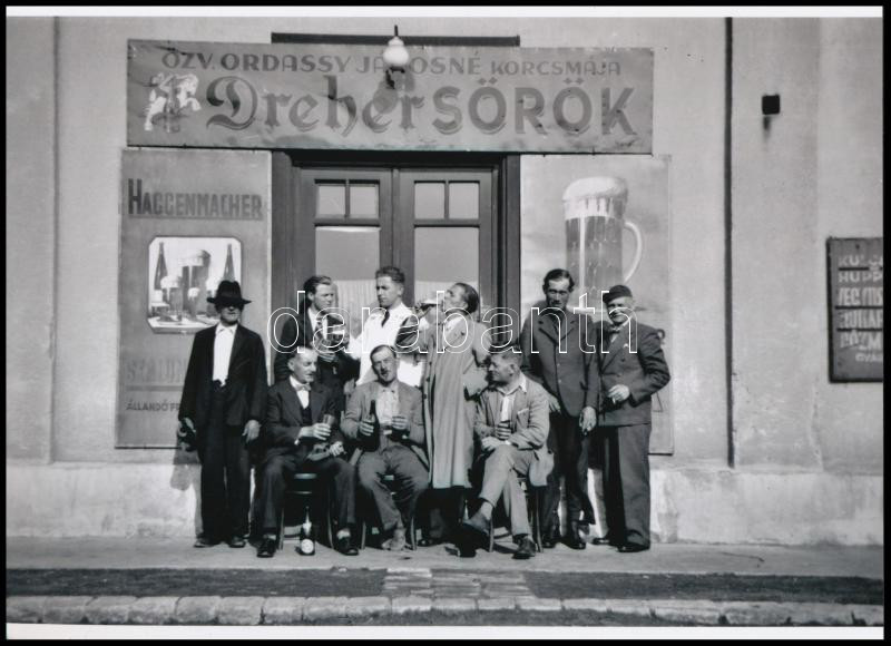cca 1937 Felvidéki Dreher söröző, özv. Ordassy Jánosné korcsmájának utcai portálja és törzsvendégei, 1 db modern nagyítás, jelzés nélkül, 15x21 cm