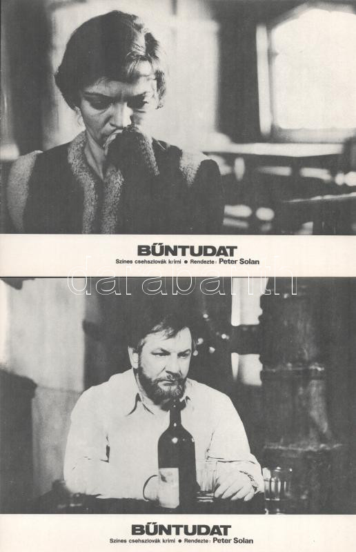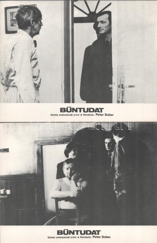 Description: cca 1982 ,,Bűntudat" című csehszlovák bűnügyi film jelenetei és szereplői, 6 db produkciós filmfotó nyomdatechnikával sokszorosítva kartonpapírra, egyoldalas nyomással, a használatból eredő (esetleges) kisebb hibákkal, 18x24 cm