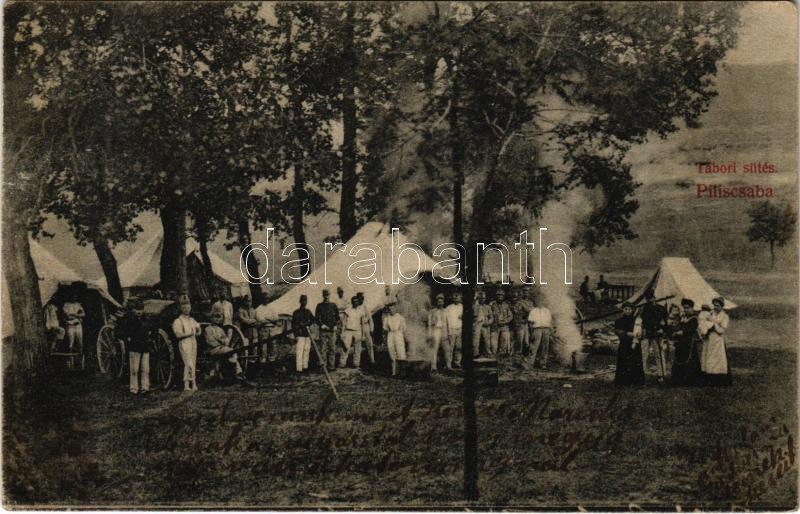 1908 Piliscsaba, Tábori sütés, osztrák-magyar katonák csoportja. Újhelyi Lajos kiadása (EK)