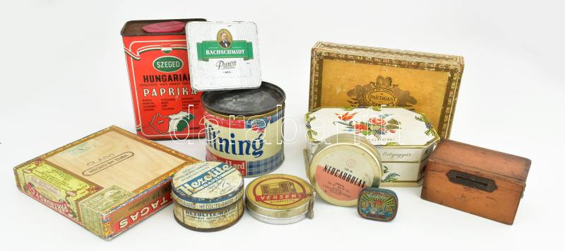 11 darab régi fém, fa és papír díszdoboz, kopásokkal, klf méretben