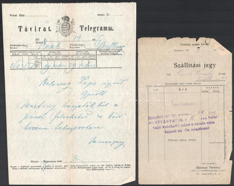 1871, 1905 Távirat Pozsonyból Győrbe, Balassa likőr szállítási jegy