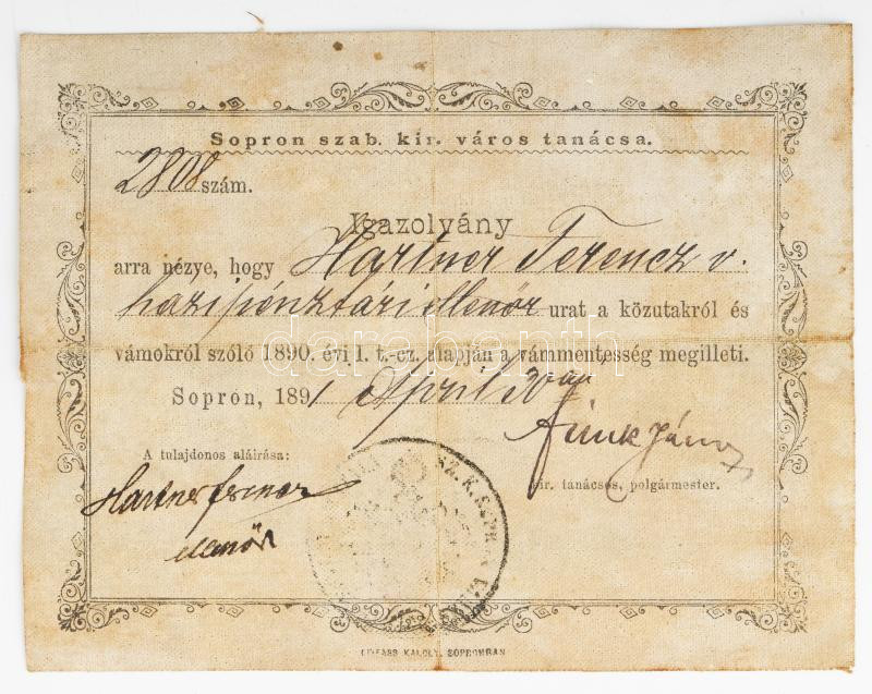 1891 Sopron, igazolvány vámmentességről, Fink (Finck) János (1837-1914) soproni polgármester autográf aláírásával, bélyegzővel, hajtásnyomokkal, kissé foltos