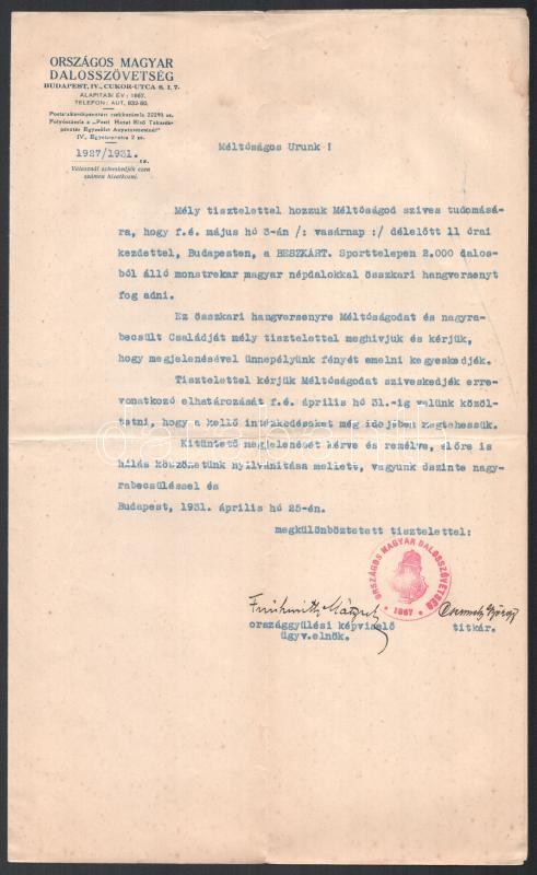 1931 Bp., Az Országos Magyar Dalosszövetség levele