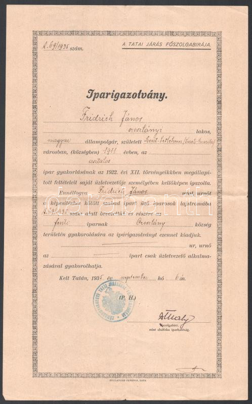 Description: 1935 Fridrich János asztalos 3 db irata: iparigazolvány, illetve határozat iparigazolvány kiadásáról, "Komáromvármegye Tatai járásának főszolgabírája" bélyegzőkkel + Krámli József épület- és műbútor asztalos által kiállított, kézzel írt igazolás