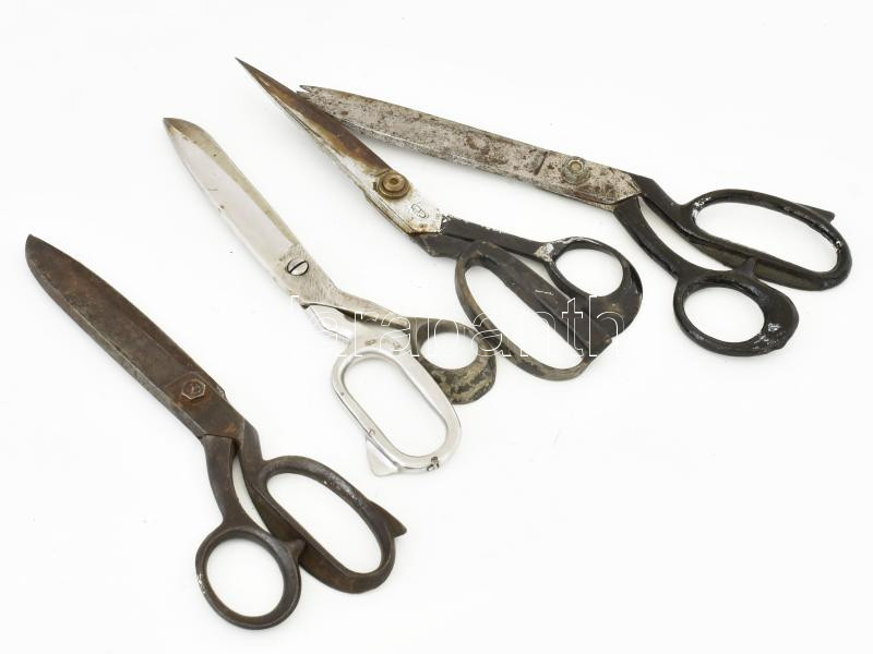4 darab antik vas szabász olló, közte jelzéssel, kopással, h: 23-26 cm