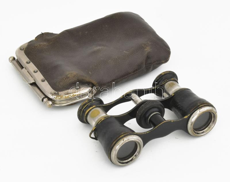 Antik színházi látcső, kopott bőr borítással, bőr tokkal