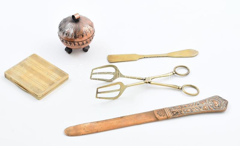 Réz tárgyak: sütemény fogó, levélnyitó, jelzett tárca.