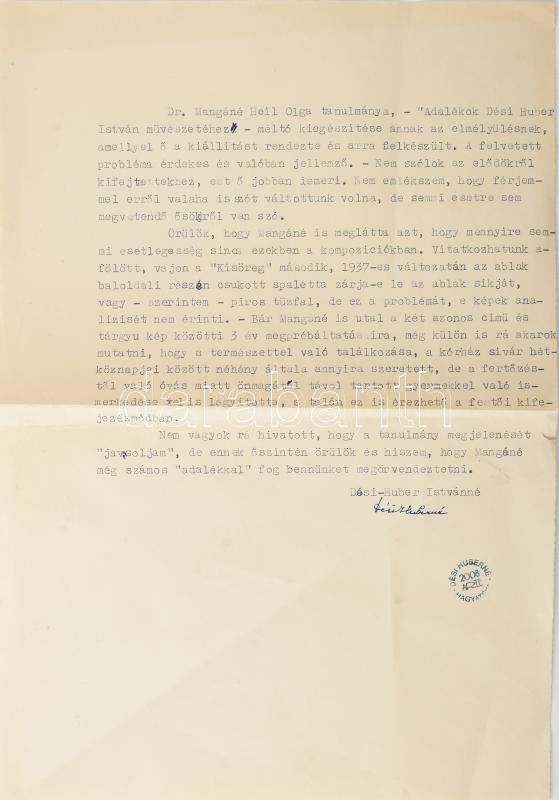 cca 1965-1970 Dési Huber Istvánné (1897-1987) gépelt irata, amelyben Dési Huber István monográfusa, Mangáné Heil Olga tanulmányáról fejezi ki véleményét. 1 géppel írt oldal, Dési Huber Istvánné autográf aláírásával