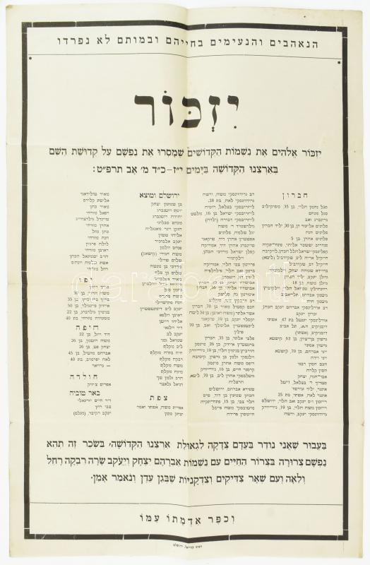 1959 Háborús áldozatok emlékére kiadott héber nyelvű emléklap névfelsorolással, hajtott, 46×29 cm