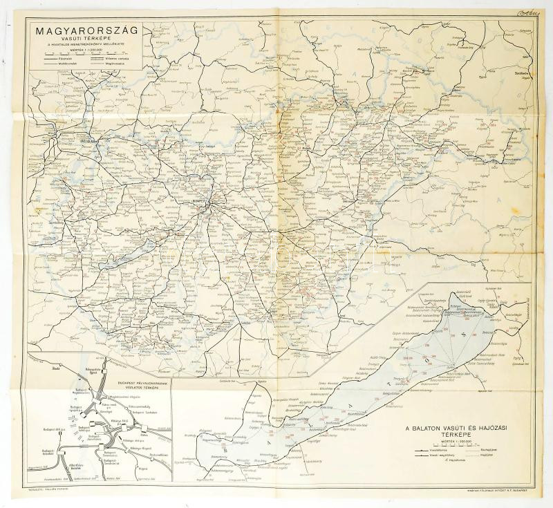 cca 1940 Magyarország vasúti térképe, a hivatalos menetrendkönyv melléklete, Balatoni vasúti és hajózási térképpel, 1:1,200.000, valamint Budapest pályaudvarainak vázlatos térképével, tervezte Tallián Ferenc, a hátoldalán a MÁVAUT autobusz-vonalak átnézeti térképével, 1:1,200.000, kiadja: Bp., Magyar Földrajzi Intézet Rt., hajtott, 51x56 cm
