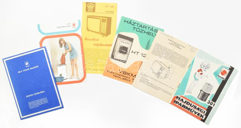 cca 1970-85 6 db vegyes prospektus és kezelési útmutató: Orion Viking tv, Junoszty tv, Hajdu mosógép és centrifuga (3 db), HT 12/A villamos tűzhely