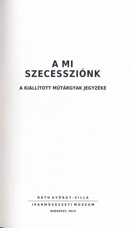 A mi szecessziónk. A kiállított műtárgyak jegyzéke. Ráth György-Villa.... https://www.darabanth.com/en/451-Online-auction/451.0/Books/Books-Architecture-Art~1000013/A-mi-szecesszionk-A-kiallitott-mutargyak-jegyzeke-Rath-Gyorgy-Villa-Bp-2019-IparmuvC3~II2951247