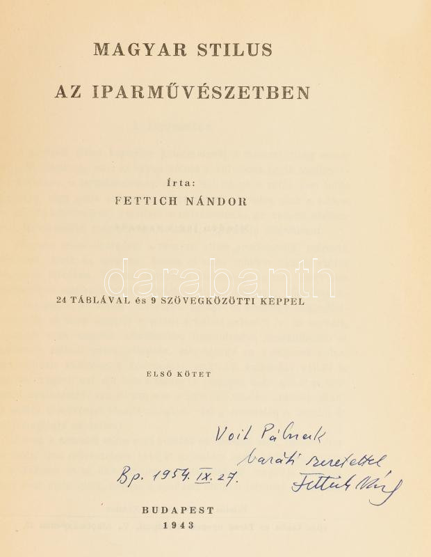 A szerző, Fettich Nándor (1900-1971) régész, ötvös által Voit Pál (1909-1988) művészettörténész részére DEDIKÁLT példány.