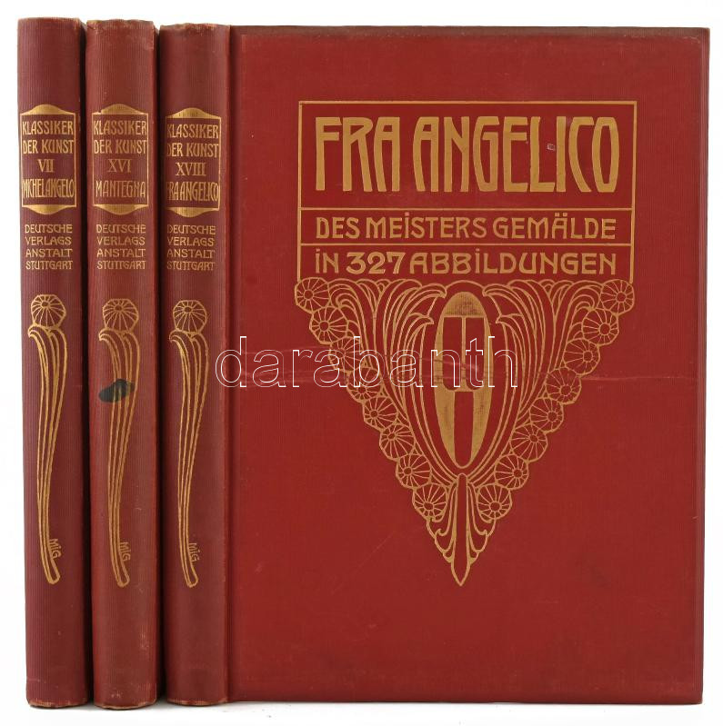 Klassiker der Kunst 3 kötete: Michelangelo, Fra Angelico, Mantegna. Stuutgart und Leipzig, 1907-1911, Deutsche Verlags-Antalt. Kiadói szecessziós, aranyozott egészvászon kötésben, borítón és gerincen kopásnyomokkal, Mantegna kötet gerincén és lapjai tetején kissé foltos, Fra Angelico lapjai tetején kissé foltos, máskülönben jó állapotban.