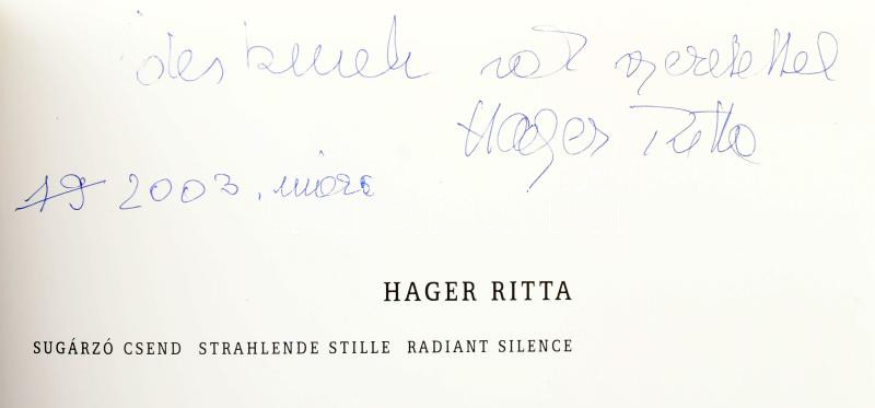 Kőrösiné dr. Merkl Hilda (szerk.): Hager Ritta - Sugárzó csend. Hager Ritta Henriette (1931-) a Nemzet Művésze címmel kitüntetett, Kossuth-díjas textiltervező, gobelinművész által Haraszty István "Édeskének" (1934-2022), Kossuth-díjas szobrász, festőművész részére DEDIKÁLT! Berlin, 2001, Hager Ritta. Kiadói papírkötés