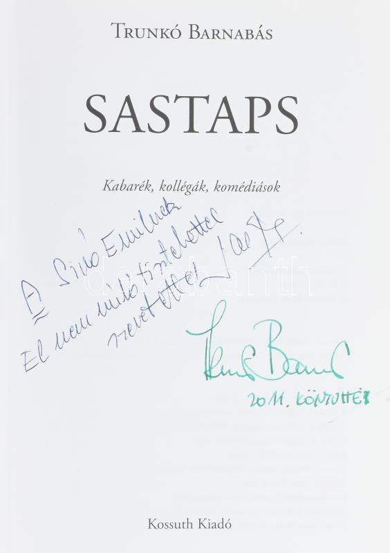 Trunkó Barnabás: Sastaps. Bp., 2011. Kossuth. Sas József és Trunkó Barnabás által DUPLÁN DEDIKÁLT. Kiadói kartonált papírkötés, papír védőborítóval.