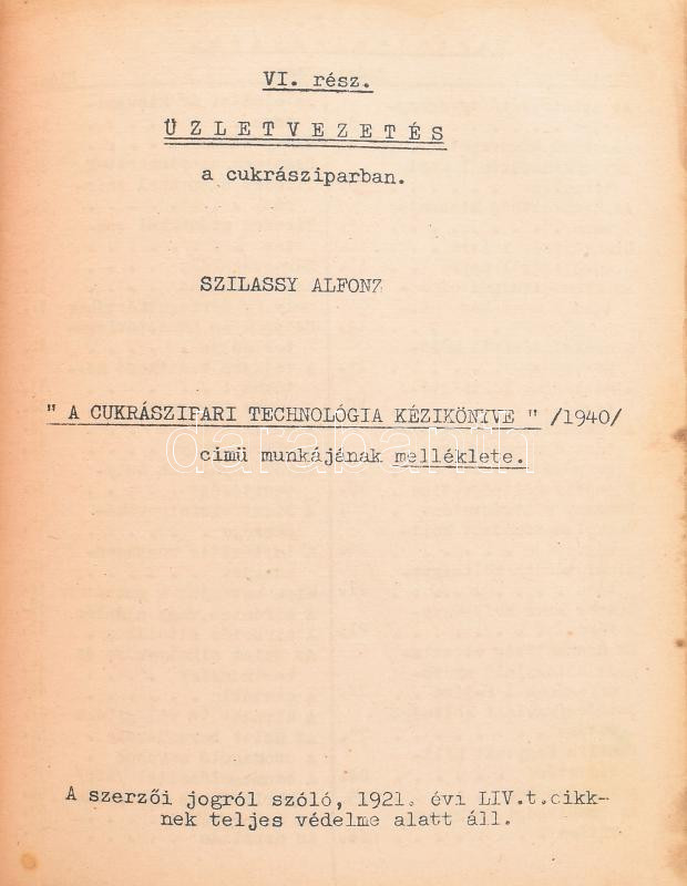 Szilassy Alfonz: A sütő- és cukrász-ipari technologia kézikönyve. V-VI. rész. V. rész.: Cukrász technológia. VI. rész.: Üzletvezetés a cukrásziparban.Bp.,1941, Szendrői Rezső-ny., 4+385+3+66 p. Átkötött félvászon-kötés, kopott borítóval, foltos, restaurált lapokkal, bejegyzésekkel, javított kötéssel, a kötéstábla belsején a lapok és a szennyalapok pótoltak. "Profeld Vilmos csáktornyai cukrász mester névbélyegzéseivel."