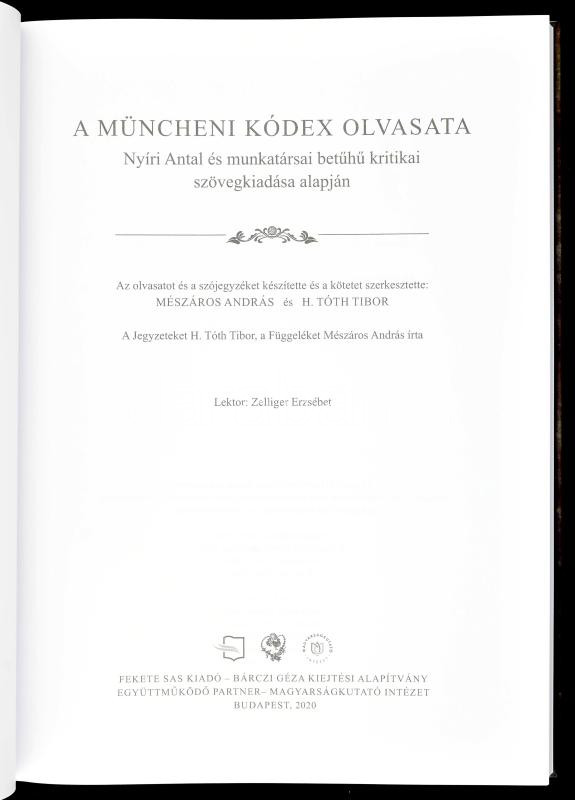 Description: A Müncheni Kódex olvasata. Nyíri Antal és munkatársai betűhű kritikai szövegkiadása alapján. Az olvasatot és a szójegyzéket készítette és a kötetet szerk.: Mészáros András és H. Tóth Tibor. Bp., 2020, Fekete Sas - Bárczi Géza Kiejtési Alapítvány - Magyarságkutató Intézet. Kiadói kartonált papírkötés, jó állapotban.