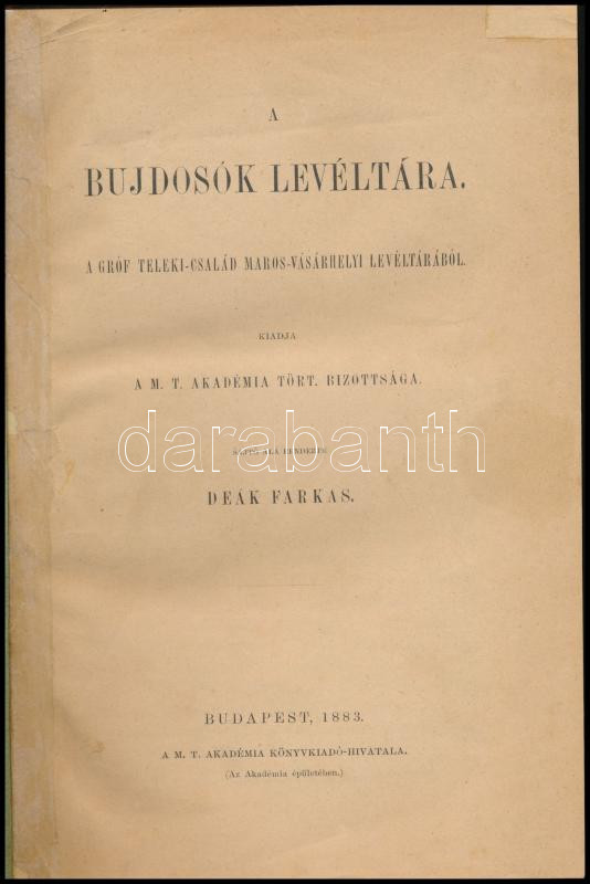 A bujdosók levéltára. A gróf Teleki-család maros-vásárhelyi levéltáráb... https://www.darabanth.com/en/451-Online-auction/451.0/Books/Books-History~1000011/A-bujdosok-leveltara-A-grof-Teleki-csalad-maros-vasarhelyi-leveltarabol-Sajto-ala-ren~II3002649