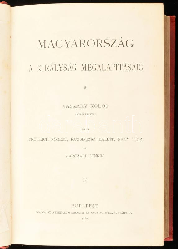Frőhlich Róbert - Kuzsinszky Bálint - Nagy Géza - Marczali Henrik: Magyarország a királyság megalapításáig. Vaszary Kolos bevezetésével. A Magyar Nemzet Története I. köt. Szerk.: Szilágyi Sándor. Bp., 1895, Athenaeum. Gazdag szövegközi és egészoldalas, fekete-fehér és színes képanyaggal, kihajtható mellékletekkel, térképpel. Kiadói aranyozott félbőr-kötés, kissé viseltes borítóval, belül nagyrészt jó állapotban, régi intézményi bélyegzőkkel.