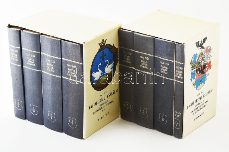 Description: Nagy Iván: Magyarország családai czímerekkel és nemzedékrendi táblákkal. 1-8. kötet. Bp., 1987, Helikon. Kiadói egészvászon-kötésben, karton-tokban, Szakály Ferenc: A Nagyiván c. tanulmány füzettel. Az 1857-1868. közötti kiadás (Pest, Ráth Mór) nyolckötetes reprint kiadása.