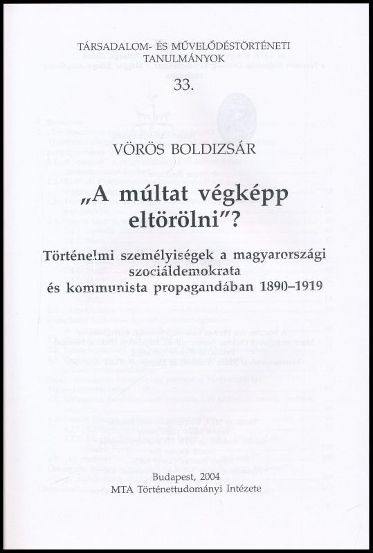 Description: Vörös Boldizsár: ,,A múltat végképp eltörölni"? Történelmi személyiségek a magyarországi szociáldemokrata és kommunista propagandában 1890-1919. Bp., 2004, MTA Történettudományi Intézet. Kiadói papírkötés.