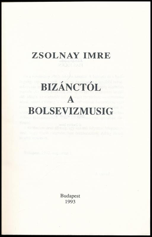 Zsolnay Imre: Bizánctól a bolsevizmusig. Bp., 1993, Szerzői kiadás, 220+4 p. Kiadói papírkötés, kissé foltos gerinccel.