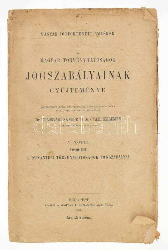 Description: Dr. Kolosvári Sádnor - Dr. Óvári Kelemen: A magyar törvényhatóságok jogszabályainak gyűjteménye. V. köt. második fele. A dunántúli törvényhatóságok jogszabályai. Magyar jogtörténeti emlékek. Bp., 1904, Magyar Tudományos Akadémia (Athenaeum-ny.), LVIII+(6)+585 p. Kiadói papírkötés, kissé viseltes, sérült borítóval, helyenként sérült lapszélekkel, nagyrészt felvágatlan lapokkal.