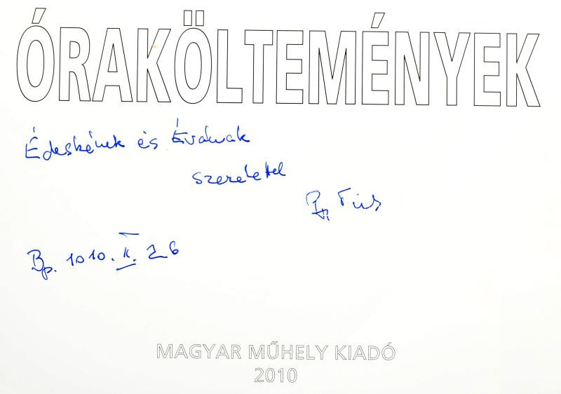 Papp Tibor: Óraköltemények. A szerző, Papp Tibor (1936- 2018) József Attila-díjas író, költő, műfordító, tipográfus, szerkesztő, a Magyar Műhely tagja által Haraszty István "Édeskének" (1934-2022), Kossuth-díjas szobrász, festőművész és feleségének DEDIKÁLT példány. Bp.,2010, Magyar Műhely, 56 p. Kiadói papírkötés.