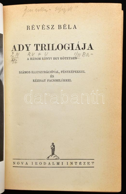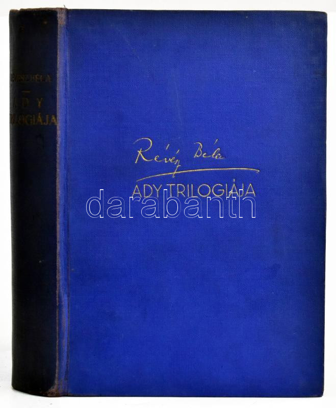 Révész Béla: Ady trilógiája. A három könyv egy kötetben. Számos illusztrációval, fényképekkel és kézirat facsimilékkel. Bp., 1935, Nova, 1 t. (címkép, Ady portréja, Székely Aladár felvétele) + 365+(3) p.+ 8 (fekete-fehér képek) t. Kiadói aranyozott egészvászon-kötés, kissé kopottas borítóval és gerinccel, belül nagyrészt jó állapotban.