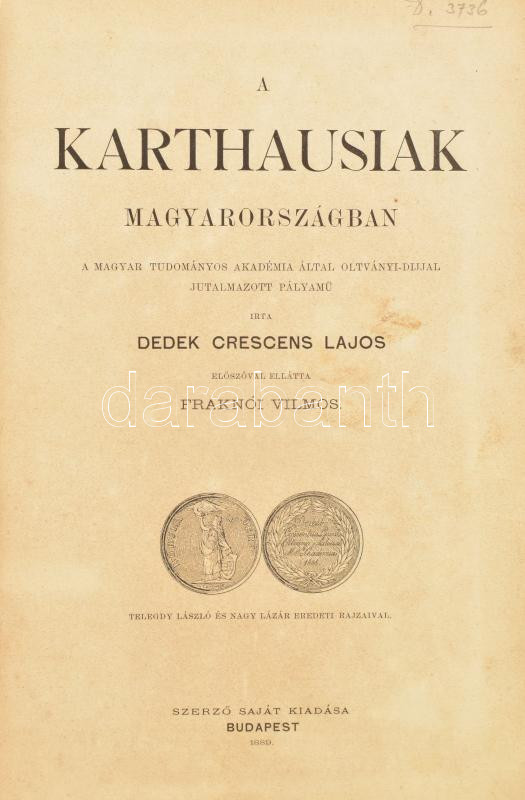 Dedek Crescens Lajos: A karthausiak Magyarországban. Fraknói Vilmos előszavával. Bp., 1889., Szerzői,(Szent István-ny.), III+254+4 p. Telegdy László, és Nagy Lázár rajzaival. Szövegközti illusztrációkkal. Félvászon-kötés, sérült gerinccel, kopott borítóval, előzéklap és szennylap hiányzik.