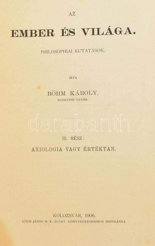 Böhm Károly: Az ember és világa. Philosophiai kutatások. III. rész: Ax... https://www.darabanth.com/en/451-Online-auction/451.0/Books/Books-Social-sciences~1000020/Bohm-Karoly-Az-ember-es-vilaga-Philosophiai-kutatasok-III-resz-Axiologia-vagy-ertektan~II2956523