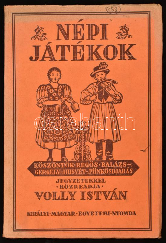 Description: Volly István: Népi játékok. I. köt. Köszöntők - lucázás - regölések - balázs- és gergelyjárás - húsvét- és pünkösdjárás. Jegyzetekkel közreadja: - - . Bp., 1941., Kir. M. Egyetemi, 68 p. Második, javított kiadás. Fekete-fehér illusztrációkkal. Kiadói papírkötés, foltos borítóval.