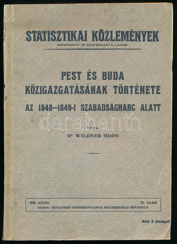 Dr. Wildner Ödön: Pest és Buda közigazgatásának története az 1848-1849-i szabadságharc alatt. Statisztikai Közlemények 86. köt. 3. sz. Bp., [1936], Budapest Székesfőváros Statisztikai Hivatala, 144 p. Kiadói papírkötés, kissé sérült gerinccel, néhány sérült lappal.