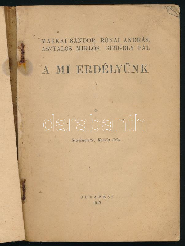 Makkai Sándor, Rónai András, Asztalos Miklós, Gergely Pál: A mi Erdélyünk. Nemzeti Könyvtár 24-26. sz. Bp., 1940, Stádium Kiadói papírkötés, foltos borítóval, kopottas állapotban.