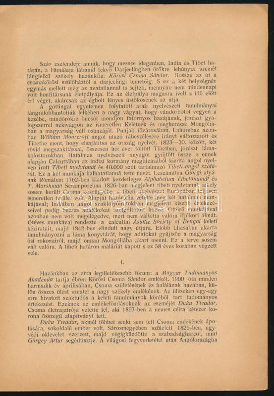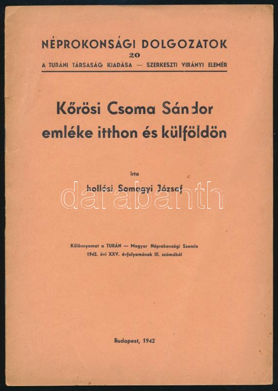 Somogyi József: KÅ‘rösi Csoma Sándor emléki itthon és külföldön. Néprokonsági Dolgozatok 20. (Különnyomat a Turán - Magyar Néprokonsági Szemle 1942. évi XXV. évfolyamának III. számából). Bp., 1942, Turáni Társaság ("Élet"-ny.), 7 p. Kiadói tűzött papÃrkötés.
