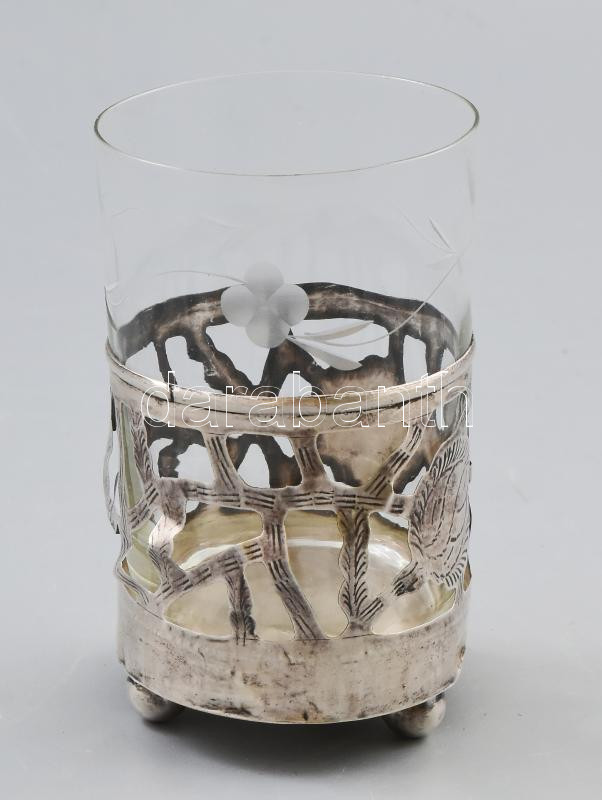 Csiszolt pohár ezüst (Ag) tartóban, jelzett, nettó: 22 g, kissé deformált
