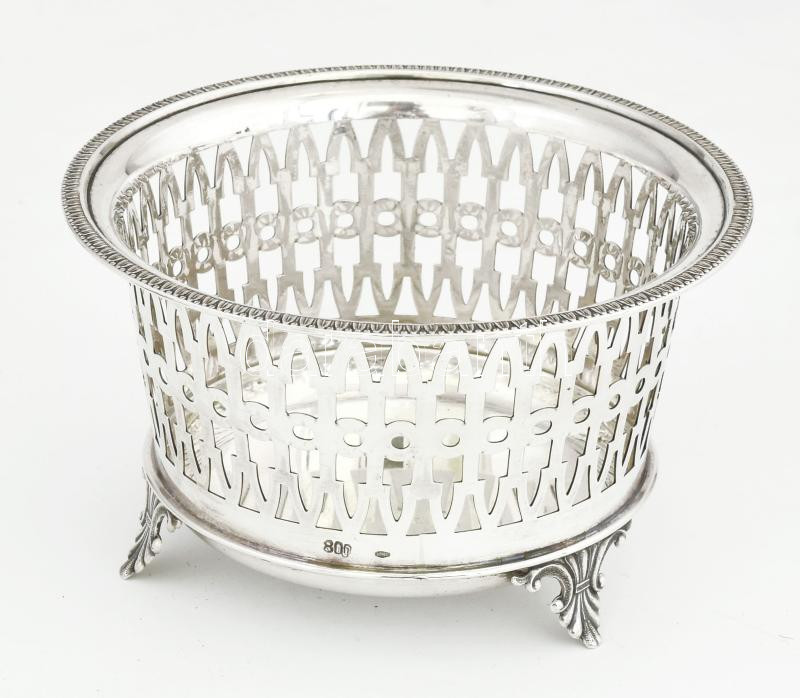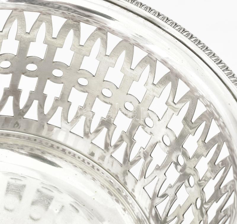 Ezüst(Ag) áttört háromlábú kerek kínáló, jelzett, d: 12 cm, nettó: 128 g