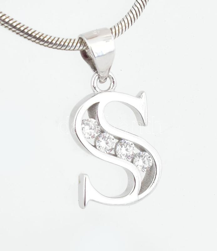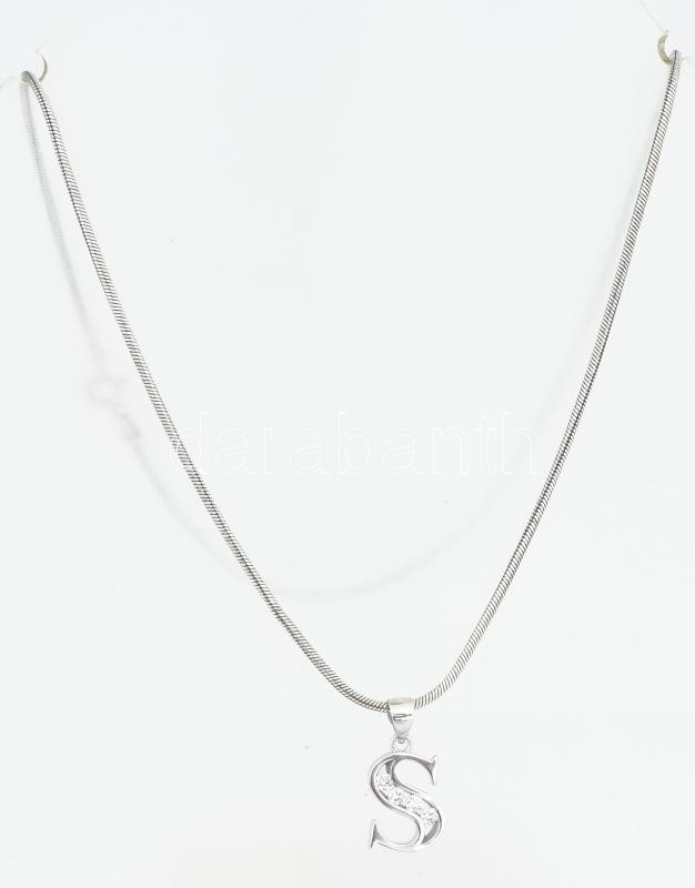 Ezüst(Ag) kígyó nyaklánc áttört köves "S" medállal, jelzett, h: 46 cm, 2,2×1,1 cm, bruttó: 9,4 g