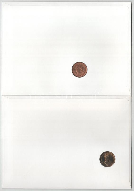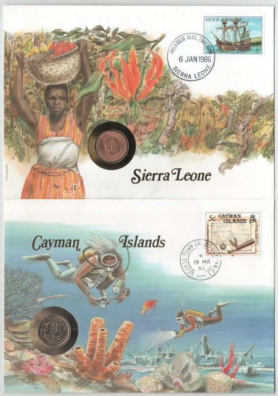 5db-os érmés boríték tétel, mind különféle és német nyelvű tájékoztatóval, benne: Tuvalu, Ascension, Dominika, Sierra Leone, Kajmán-szigetek