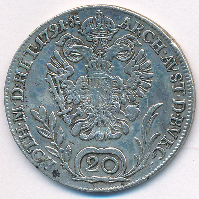 https://www.darabanth.com/en/451-Online-auction/451.0/Numismatics/Hungarian-coins-and-coins-with-Hungarian-mint-marks~1500008/1791B-20kr-Ag-II-Lipot-6-63g-TVF-ph-patina-Hungary-1791B-20-Kreuzer-Ag-Leopold-II-6-63g~II2996766