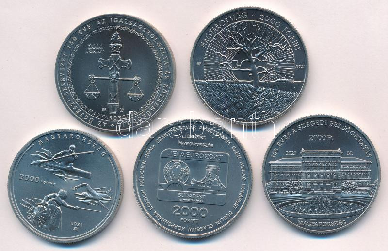 2021. 2000Ft Cu-Ni "Az Önálló Ügyészi Szervezet alapítására" + 2000Ft Cu-Ni "Pilinszky János" + 2000Ft Cu-Ni "XXXII. Nyári Olimpiai Játékok - Magyarock" + 2000Ft Cu-Ni "XVI. UEFA Labdarúgó-Európa-bajnokság" + 2000Ft Cu-Ni "100 éves a szegedi felsőoktatás" T:BU