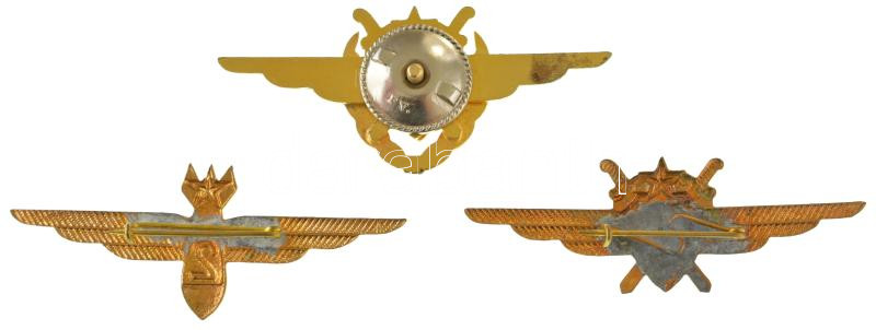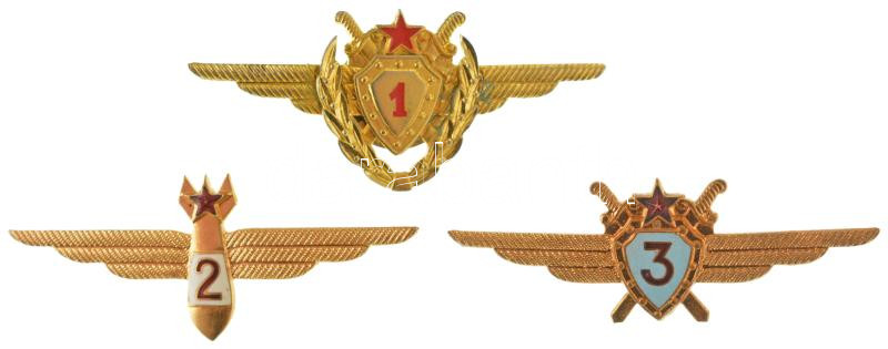 3db-os katonai repülős jelvénytétel, közte ~1958-1968. "Magyar Néphadsereg III. osztályú repülőgépvezető" zománcozott, aranyozott fém kitüntető jelvény (23x66mm) + ~1958-1968. "II. osztályú bombázó" aranyozott, zománcozott fém kitüntető jelvény (26x67mm) + ~1975. "Magyar Néphadsereg Aranykoszorús I. osztályú repülőgépvezető" aranyozott, műgyantás kitüntető jelvény, hátoldalán "PV" gyártói jelzéssel (29x67mm) T:AU kis patina