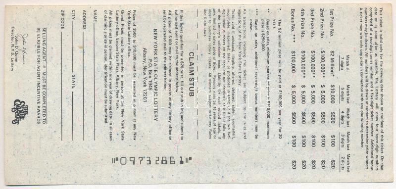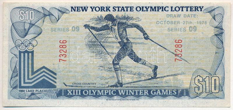 Description: Amerikai Egyesült Államok / New York 1978. "XIII. Téli Olimpiai Játékok" sorsjegy 10$ értékben, "09 73286" sorozat és sorszámmal T:AU