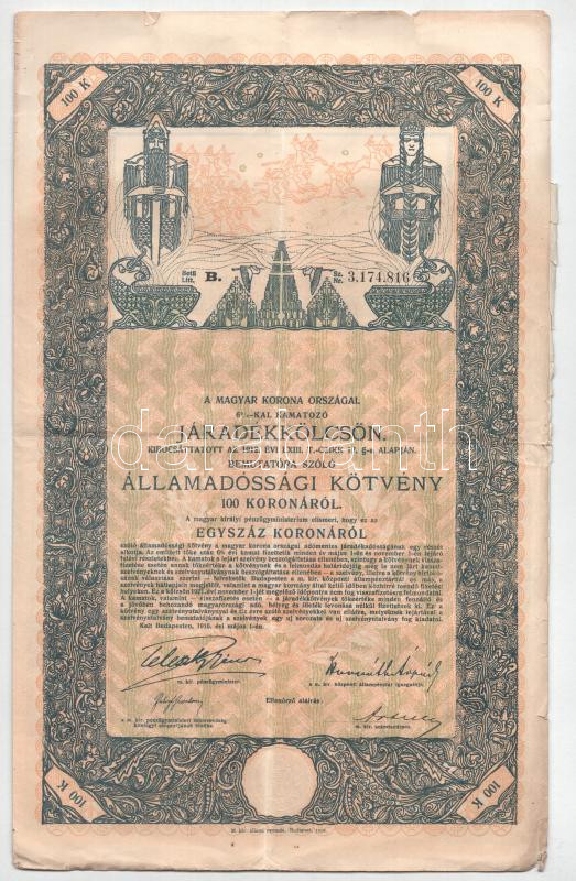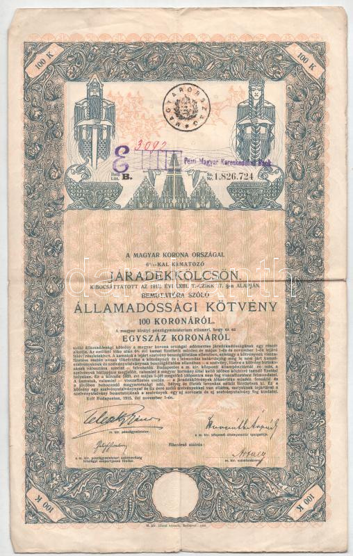 Description: Budapest 1914-1915. "A Magyar Korona Országai 6%-kal kamatozó Járadékkölcsön" bemutatóra szóló államadóssági kötvénye 100K-ról szárazpecséttel, bélyegzéssel, egyik szelvényekkel (2x) T:F