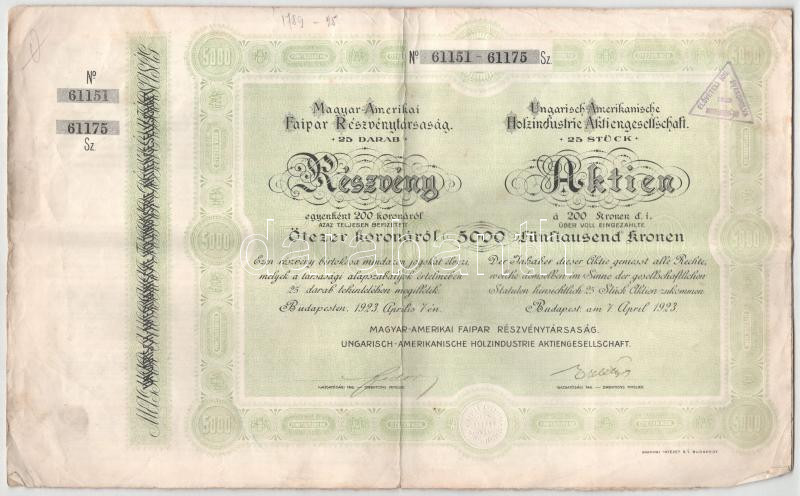 Budapest 1918. "Magyar-Amerikai Faipar Részvénytársaság" rés... https://www.darabanth.com/en/451-Online-auction/451.0/Numismatics/Shares-and-Tickets~1500005/Budapest-1918-Magyar-Amerikai-Faipar-Reszvenytarsasag-reszvenye-200K-rol-magyar-es-neme~II2995477