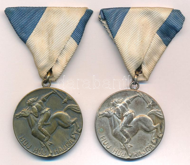 Szigethy István (1891-1966) 1934. "Huj huj hajrá!" ezüstözött fém díjérem, hátoldalon "Z.E.1.P.L.E 1934 Egyéni IV. díj" véséssel, "ARKANZAS BPEST" gyártói jelzéssel, mellszalagon (40mm) + 1934. "Huj huj hajrá!" bronz díjérem, hátoldalon "Z.E.1.P.L.E 1934 Egyéni VII. díj" véséssel, "ARKANZAS BPEST" gyártói jelzéssel, mellszalagon (40mm) T:XF