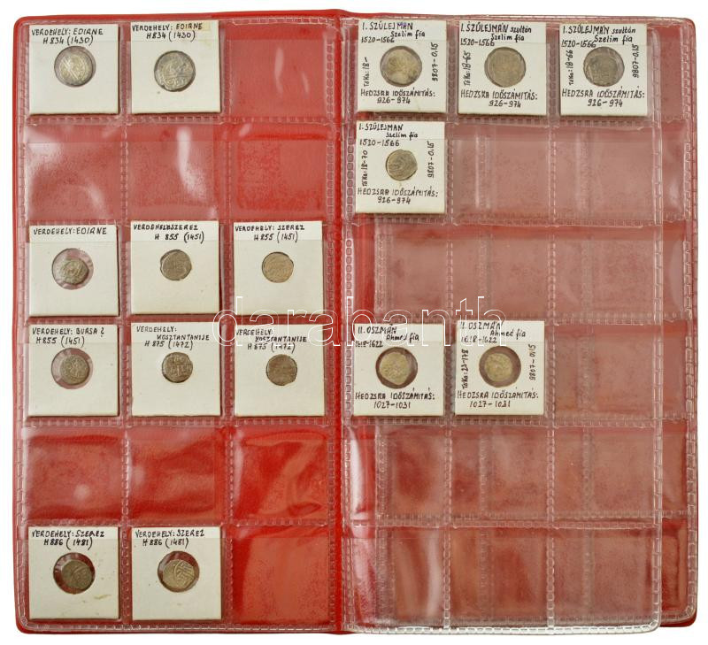 Oszmán Birodalom 1430-1618. 16db-os Akcse Ag érmetétel kisalakú, fekete műbőr berakóban. Az érmék mindegyike előzetesen meghatározva, a szultán nevével, verdehellyel, némelyik évszámmal is ellátva. Benne II. Murád, II. Mehmed, II. Bajezid, I. (Nagy) Szulejmán és II. Oszmán szultánok érméi. T:vegyes, főleg AU-VF Ottoman Empire 1430-1618. 16pcs Akce Ag coin lot in black coin holder. Each of the coins is pre-defined, marked with the sultan's name, place of minting, and with the year on some pcs. Within the coins of Murad II, Mehmed II, Bayezid II, Suleiman (the Great) I and Ottoman II. C:mixed, mostly AU-VF